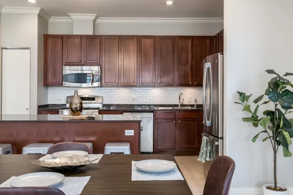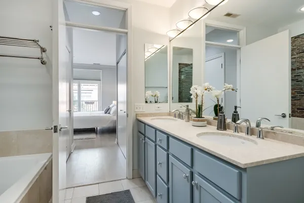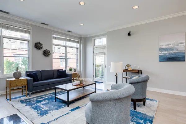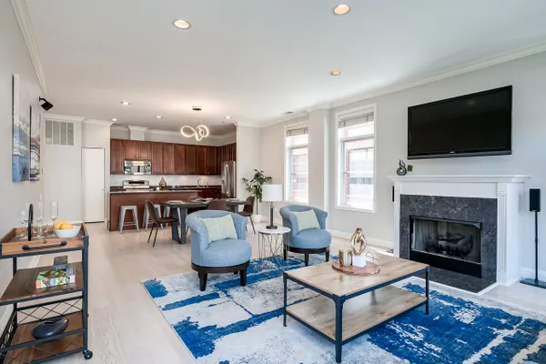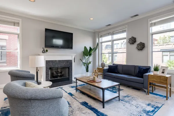 Fulton Market Living at Its Best! If you're looking for space, light, and comfort in a 2bd/2ba home, this spacious residence checks every box! Oversized windows flood the open layout with natural light, highlighting hardwood floors, tall ceilings, space for a full dining table and a cozy living room with fireplace and wired for surround sound making it perfect for both entertaining and relaxing. The chef's kitchen impresses with 42" cabinets, granite countertops, a functional breakfast bar island, glass tile backsplash, and stainless steel appliances. The king-sized primary suite is a private retreat, complete with multiple closets including a walk-in and a luxurious en suite bath featuring dual vanity, soaking tub, and a separate stone shower. The spacious guest bedroom easily fits a queen bed, while the second full bath is conveniently accessible. Step out onto the private balcony, accessible from both the living room and primary suite, for your morning coffee or evening unwind. Additional perks include in-unit laundry, large storage closet and garage parking. Located just steps from the park, METRA, highways, and Jewel, and surrounded by some of Chicago's world-renowned dining experiences, this home truly has it all!